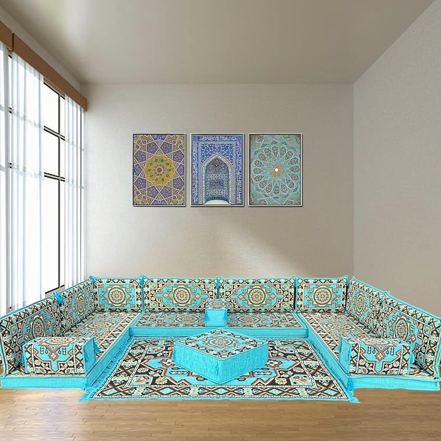 Sizes differ based on the space you have. Our team will conduct a complimentary at-home visit, and we can customize the Majlis so that it fits perfectly.